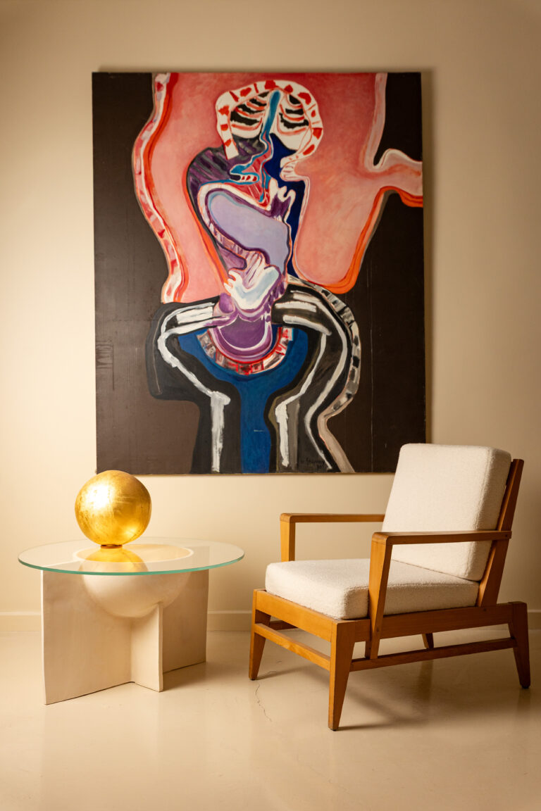 Les peintures de Jean de Gaspary et de Camille Cottier explorent des espaces mentaux et architecturaux où la mémoire se mêle à l’anticipation. Les formes semblent suspendues dans un temps indéfini, oscillant entre souvenir et projection Les céramiques de Géraldine Cornette de St Cyr, Antoine Marquis, Rousse Céramique et Basile Boon inscrivent le geste artisanal dans une temporalité lente, presque archéologique, tout en affirmant une écriture d’aujourd’hui. Le mobilier de Pierre Guariche, Oud Architecture et Jean Couvreur et Isabelle Stanislas (qui signe le cabinet de travail pour la galerie) ponctue l’exposition comme un repère familier et intemporel, soulignant la continuité des usages et la modernité persistante des formes.