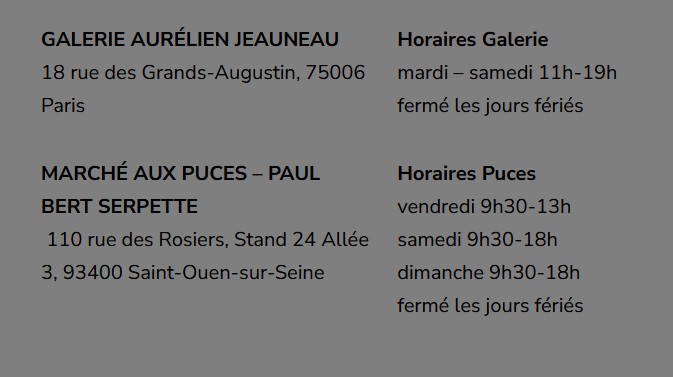 La galerie Aurélien Jeauneau est une galerie dédiée aux Arts Décoratifs et à leurs représentants, un espace pour ceux qui façonnent le monde. Par une sélection exigeante de mobilier et d’art, la galerie conjugue patrimoine historique et design contemporain Un dialogue permanent, qui célèbre le processus créatif et le travail de l’Homme à travers ses mains. Outre les pièces historiques de Pierre Paulin et Pierre Guariche dont Aurélien est un spécialiste reconnu, on retrouve parmi les œuvres contemporaines celles de l’architecte Isabelle Stanislas qui a dessiné pour la galerie un cabinet de travail sur-mesure emblématique de l’âme du lieu, dans la veine des grands décorateurs français du XXe siècle.